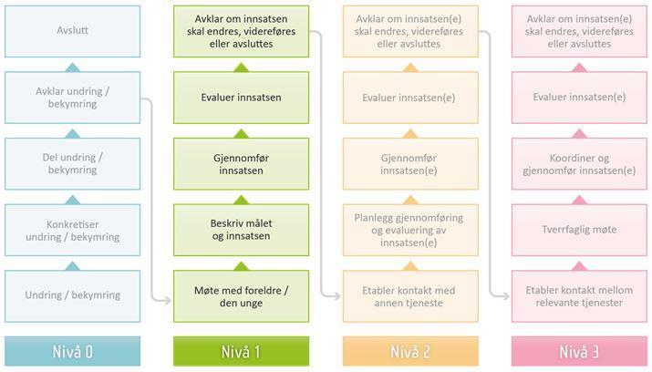 Hva: Evaluering av gjennomførte tiltak og aktuelt utfordringsbilde avgjør om en skal fortsette på nivå 1 med system-/individtiltak i barnehagen og hjemmet, eller om det er behov for å drøfte utfordringene og resultat av gjennomførte tiltak i Ressursteam. I Ressursteam drøftes det om tiltak skal fortsette på nivå 1 eller tas videre til nivå 2 og tiltak i andre tjenester.