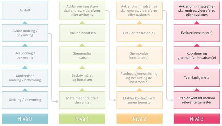Hva: Vurder om innsatsen skal avsluttes, fortsette eller justeres. Dokumenter hvorfor saken avsluttes i barnets mappe. Vurder om saken skal videreføres på nivå 3, eller flyttes til nivå 1 eller nivå 2