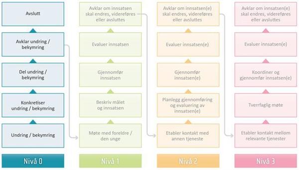 Hvordan: Er det grunn til å videre? Hvis nei, avsluttes saken. Avslutt notater/skjemaer og arkiver. Hvis ja, vurderes behov for å gå videre til nivå 1 med a) individtiltak og/eller b) systemtiltak i skolen. Grad av formalisering må vurderes