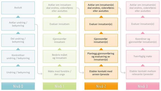 Hva: Ved avslutning av saken, dokumenter hvorfor saken avsluttes i elevens mappe. Vurder om saken skal videreføres på nivå 2, eller flyttes til nivå 1 eller nivå 3
